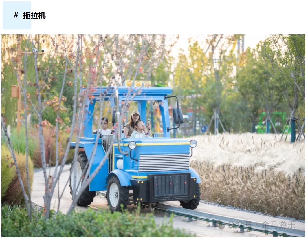 拖拉機(jī)是一款模擬農(nóng)用拖拉機(jī)造型為主題的小火車類型設(shè)備,車輛外觀造型和內(nèi)飾均逼真還原真實(shí)的拖拉機(jī),孩子可以通過把玩方向盤,手動(dòng)撥桿等部件體驗(yàn)駕駛拖拉機(jī)的感覺,豐富孩子的認(rèn)知,增加觀光游玩的趣味性。拖拉機(jī)每輛車設(shè)置4個(gè)座位,前排為兒童座,后排為成人座,一家人乘坐拖拉機(jī)穿梭在美麗的風(fēng)景中,欣賞美景的同時(shí)共享天倫之樂。