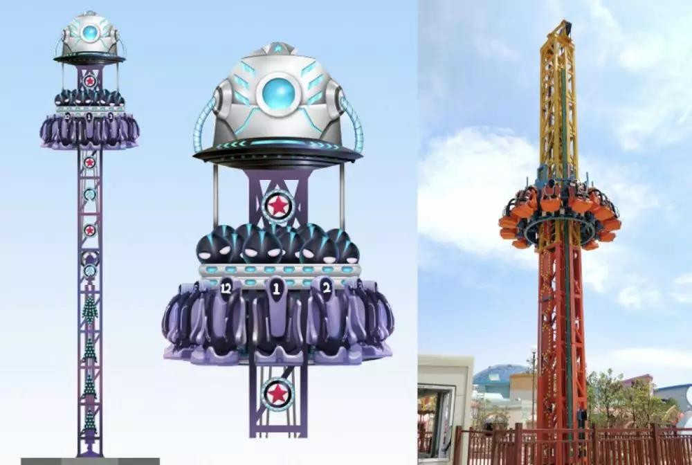 QWT-12D旋轉(zhuǎn)青蛙跳是一款塔類游樂項目,主要由塔體、塔底架、座艙組成,通過鋼絲繩,滑輪組和油缸帶動下,座艙可以在塔體上做上下移動。通過使用蓄能器和電氣控制,使座艙完成像青蛙一樣跳動的動作,讓游客經(jīng)歷從失重,到減速,再到回彈等一系列連貫的動作,充分體驗到這種連貫跳躍的樂趣。除此之外,座艙結(jié)構(gòu)分為內(nèi)外圈,外圈乘客部分在跳躍過程中,還會隨著電機的帶動下旋轉(zhuǎn),增加跳躍動作的復(fù)雜性,并增加游客的視覺空間。