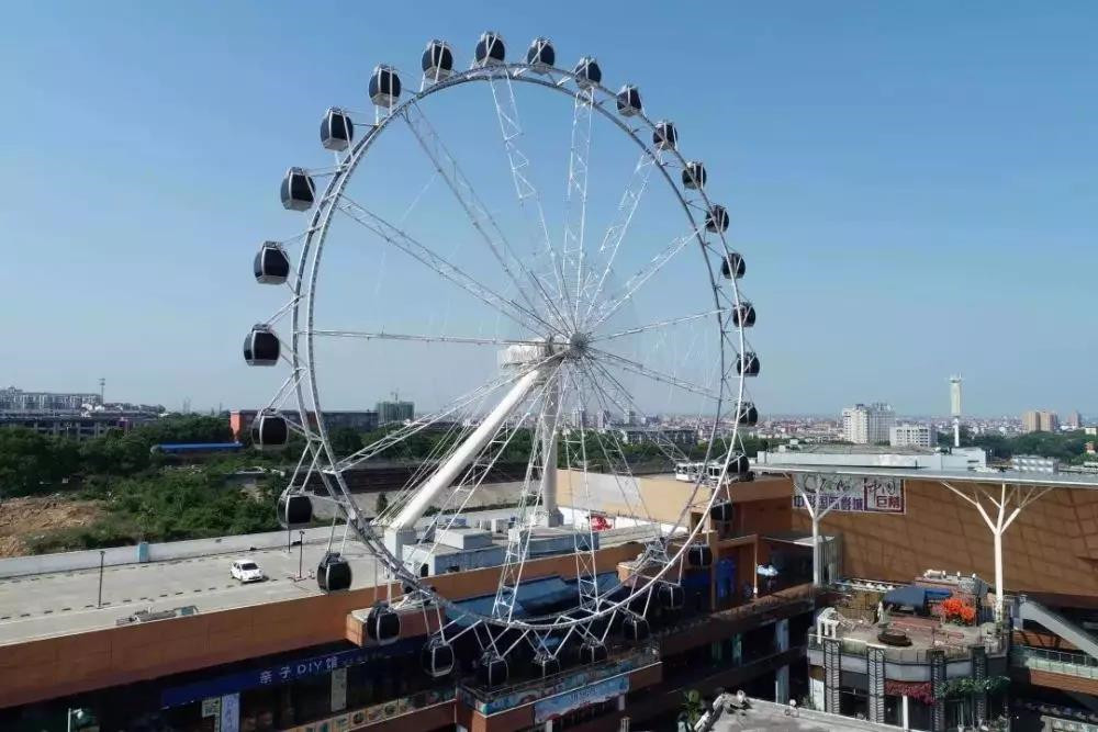 GLC-52A觀覽車是中山金馬自主研發(fā)的觀覽車類游藝機。整個產(chǎn)品由塔架、主軸、轉(zhuǎn)盤、吊廂、驅(qū)動系統(tǒng)組成。塔架由2根立柱構(gòu)成,分布在轉(zhuǎn)盤一側(cè),整個轉(zhuǎn)盤呈懸臂梁結(jié)構(gòu),在塔架支撐的基礎(chǔ)上增加鋼索固定。主軸水平布置,主軸上的轉(zhuǎn)筒隨著設(shè)備運行而轉(zhuǎn)動。轉(zhuǎn)盤采用桁架式結(jié)構(gòu),轉(zhuǎn)盤上均勻地分布著30個吊廂,每個吊廂最大乘客量6人。游客乘座吊廂沿轉(zhuǎn)盤運行,體驗著觀光賞景的樂趣;新穎獨特的懸臂結(jié)構(gòu),再配以明麗變幻、動感迷人的燈飾,別具匠心的現(xiàn)場配景,以及柔美動聽的背景音樂,使得本設(shè)備深受游客的歡迎,也是一個重要的城市地標(biāo)。