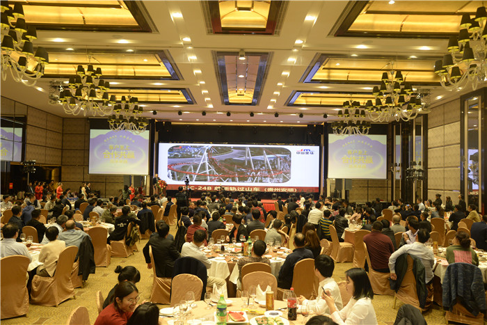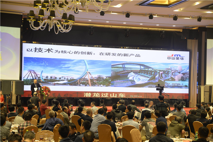 當(dāng)日,晚宴現(xiàn)場燈光璀璨,鮮花吐蕊;臺上歌舞升平,奏樂交織;臺下同仁相邀,觥籌談歡,其樂融融。整個宴會廳洋溢著一片和諧、溫馨、歡樂的氛圍。晚宴開場,公司總經(jīng)理劉總上臺致辭,對座下眾賓客的到來致以熱烈的歡迎,對長期以來關(guān)心和支持金馬發(fā)展的合作伙伴表示了誠摯的感謝,并向來賓們介紹了公司的經(jīng)營理念、企業(yè)文化、服務(wù)承諾和產(chǎn)品優(yōu)勢等。致辭中,劉總就公司最新研發(fā)和交付的產(chǎn)品作了詳細(xì)的介紹和視頻演示,斷軌過山車、垂直過山車、寬翼過山車、國內(nèi)最大飛行塔、國內(nèi)最高礦山車、室內(nèi)影視過山車等多項新技術(shù)、新產(chǎn)品不斷涌現(xiàn)在舞臺大屏中,真實錄制的設(shè)備運作視頻和逼真的研發(fā)產(chǎn)品模擬情景,如磁石般吸引著諸多聚焦的目光,更贏得了眾賓客的頻頻驚喜驚艷驚嘆的贊許聲。