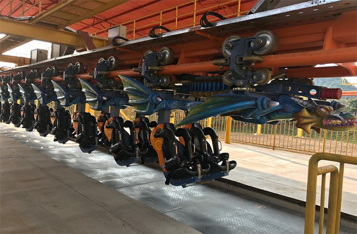 懸掛過(guò)山車的列車座椅懸掛于軌道下方,乘客懸空而坐,增加體驗(yàn)刺激度。列車經(jīng)由動(dòng)力提升到軌道最高端后,轉(zhuǎn)為沿軌道自由高速滑行,乘客坐于座椅上時(shí)盡情地享受失重、倒轉(zhuǎn)和離心的強(qiáng)烈感覺。列車外觀可根據(jù)樂園特色定制,幫助樂園打造專屬特色。