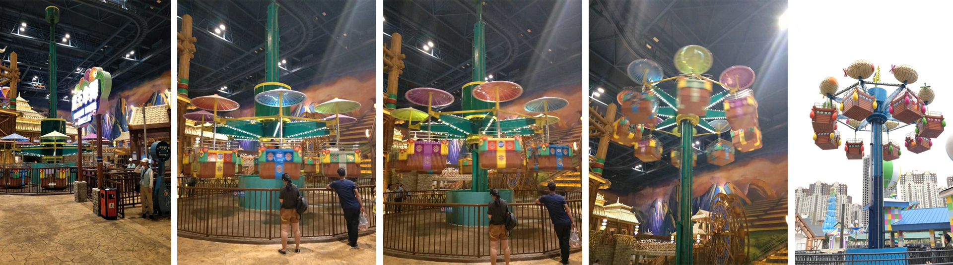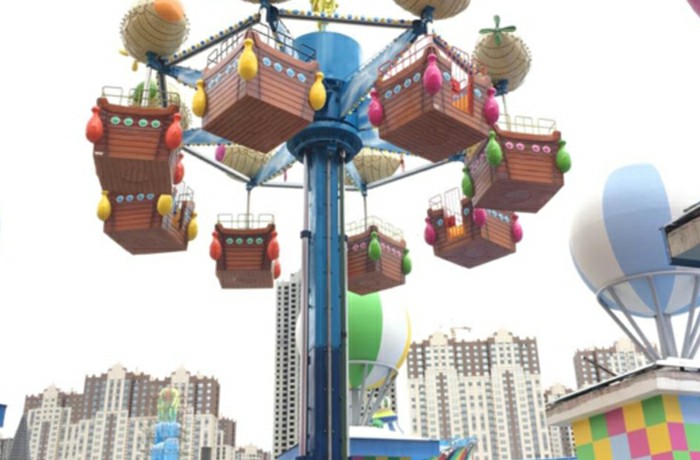 集旋轉(zhuǎn)、升降運動形式于一體的自控飛機(jī)類游藝機(jī)。逍遙塔是一款適合家庭游玩的游樂設(shè)備。設(shè)備啟動后,座艙在升降運動的同時繞立柱中心軸旋轉(zhuǎn),同時座艙還可以自由旋轉(zhuǎn),運動過程乘客可以體驗到乘坐游玩的樂趣。