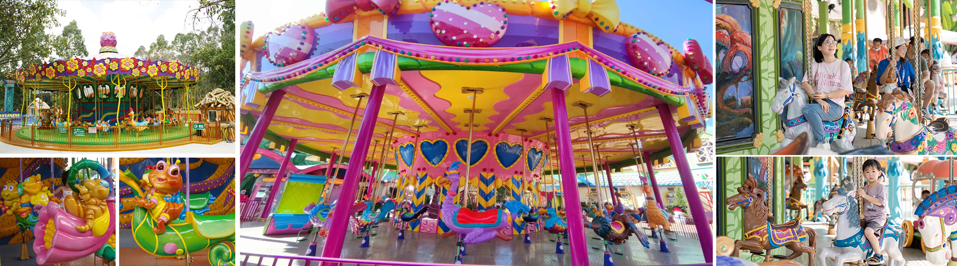 轉(zhuǎn)馬采用動(dòng)物音樂會(huì)裝飾主題,轉(zhuǎn)臺(tái)周邊鑲嵌彩色花草圖案,搭配有音樂符號(hào)的裝飾花板,并配以變幻的燈彩。轉(zhuǎn)臺(tái)上有吹奏彈唱的各類小動(dòng)物坐騎、造型別致的馬車。游客踏上轉(zhuǎn)馬,猶如踏入了小動(dòng)物們的狂歡派對(duì)之中。