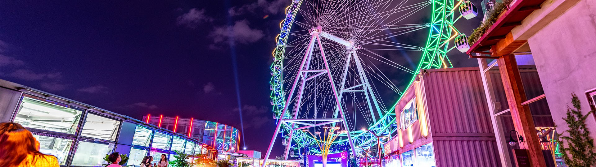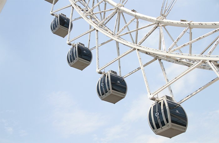 62米觀覽車,塔架由6根立柱構(gòu)成,轉(zhuǎn)盤為輻條式,轉(zhuǎn)盤上均勻分布著36個吊廂。吊廂運作時配以明麗變幻的燈飾,搭配別具匠心的現(xiàn)場配景,以及柔美動聽的背景音樂,乘客在吊箱內(nèi)平穩(wěn)悠閑地縱覽周邊美景。
