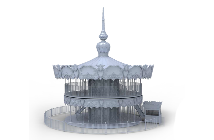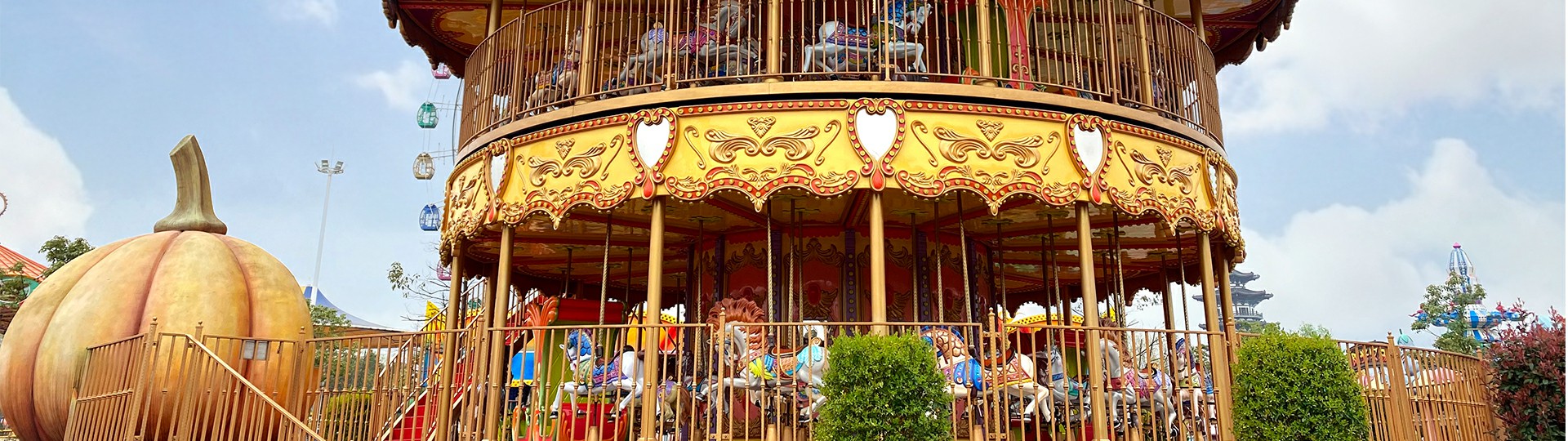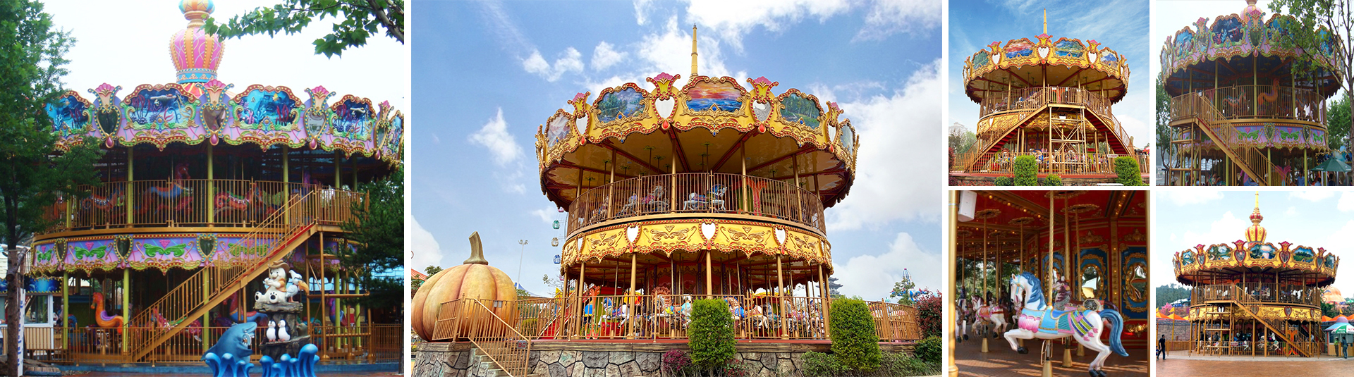 豪華雙層轉馬是上、下層可單獨作旋轉運動的裝飾豪華的轉馬,采用歐洲皇家的古典豪華的裝飾風格。蓬頂的皇冠尖塔直沖云宵,天花板、內圍板鑲嵌著彩色浮雕,并配備彩燈。馬匹及宮庭式馬車結合多彩的花飾,造型奢華大氣流光溢彩。