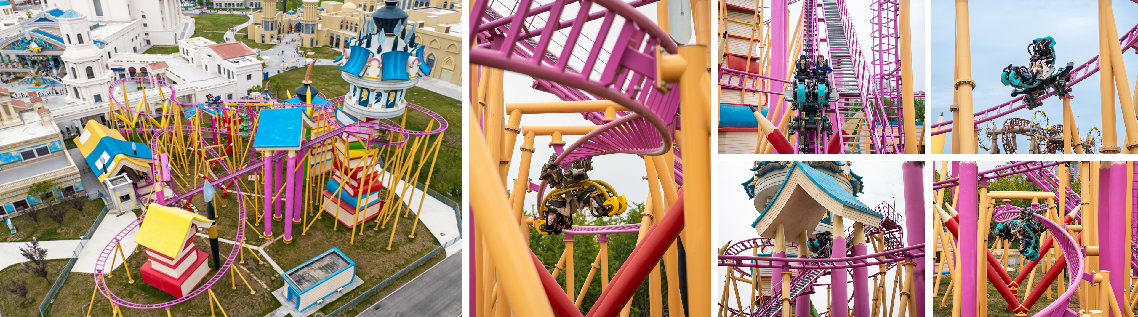 超炫過(guò)??將720°螺旋下降、?平螺旋環(huán)等元素與?轉(zhuǎn)回旋?體結(jié)合,同時(shí)創(chuàng)新地將過(guò)??有傾?的路軌引?到?旋滑?的軌道中,打造出兼具失重、超重和回旋的多重游玩體驗(yàn)。四??體中游客兩兩對(duì)坐,促進(jìn)互動(dòng)交流。奧德賽歷險(xiǎn)創(chuàng)意主題造型吸引著眾多情侶、親?游客前來(lái)挑戰(zhàn)。