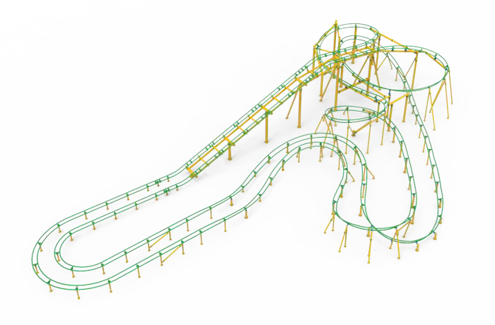 雙軌家庭過山車,共有A、B兩條軌道交互布局,每條軌道上各運行一列車,兩列車可同時出發(fā),雙車并行如競速賽跑,故又名“龜兔賽跑”。競賽元素為乘客提供更加有趣的乘坐體驗,適合親子家庭群體游玩。