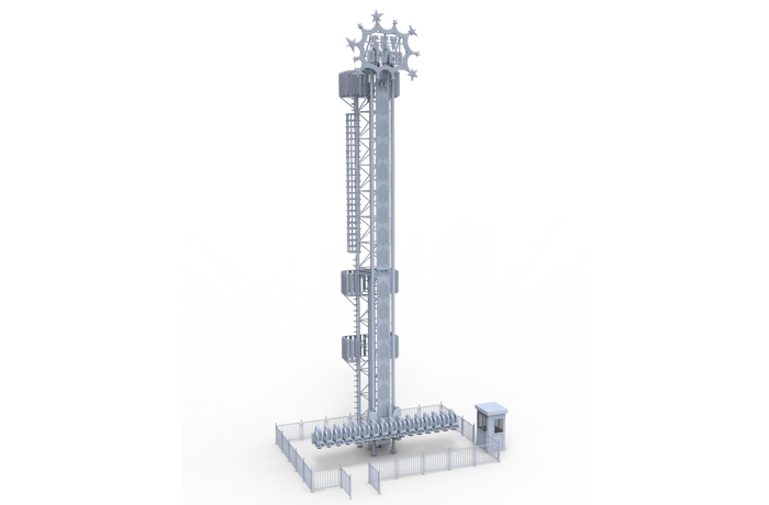 跳躍云霄以跳躍為主題,十六座座艙沿著豎直的立柱軌道作上升、下降和連貫的跳躍運動,使乘客在超重與失重的過程中體驗到跳躍樂趣。