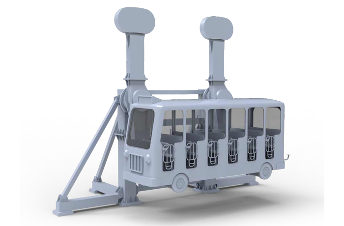 瘋狂巴士配備雙向可逆無級自動調(diào)速系統(tǒng),經(jīng)過減速、分速等一系列機構(gòu),實現(xiàn)一臺電機帶動兩個驅(qū)動臂的擺動,帶動巴士的平動,巴士在電氣系統(tǒng)的控制下可以實現(xiàn)正反兩種通過最高點的運動,給乘客以歡樂搖擺的體驗。