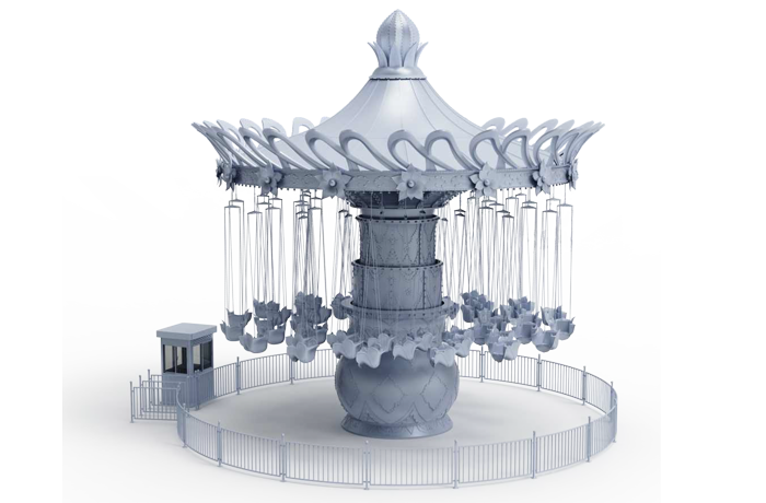 颶風飛椅設備通過傘形轉盤的旋轉和中間轉臺的錯位旋轉,實現(xiàn)飛椅的波浪式運動,乘客猶如在空中自由飛翔飄蕩。