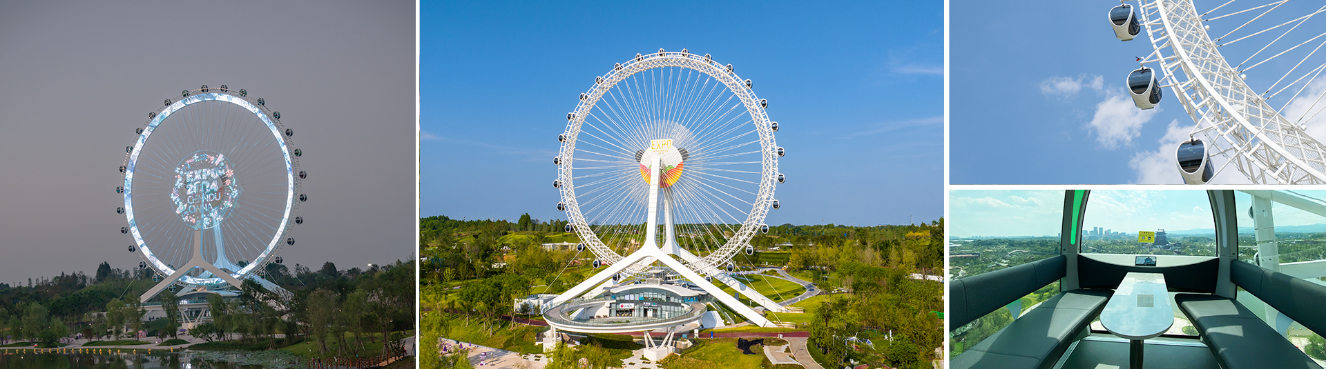 觀覽??架主??為?字形結(jié)構(gòu),轉(zhuǎn)盤為全纜索結(jié)構(gòu),由滾道和鋼纜組成。整體結(jié)構(gòu)科學(xué)合理,外觀簡潔??,充滿了科技感與?量感。觀覽?設(shè)置了30個(gè)轎廂,每個(gè)可載客8?。為了增添游客的舒適度,轎廂還配備了空調(diào)系統(tǒng)、藍(lán)??響、?線對講機(jī)、氛圍燈及內(nèi)飾座椅,在保障安全性的前提下,更具現(xiàn)代感,也更加?性化。