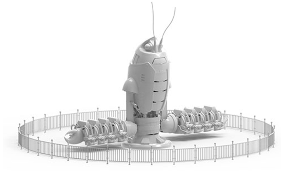 JQJ-16A巨鉗戰(zhàn)甲,設(shè)備結(jié)構(gòu)較新穎,體驗(yàn)感驚險(xiǎn)刺激。開始運(yùn)?時(shí)設(shè)備主體先上升,上升到?定?度后,進(jìn)?公轉(zhuǎn)并伴隨著座艙的?轉(zhuǎn)和升降臂的升降。整體包裝設(shè)計(jì)采?機(jī)械?蝦造型,標(biāo)志性的?蝦紅配?加上煙霧、燈光的效果,帶給游客歡樂、刺激的體驗(yàn)。