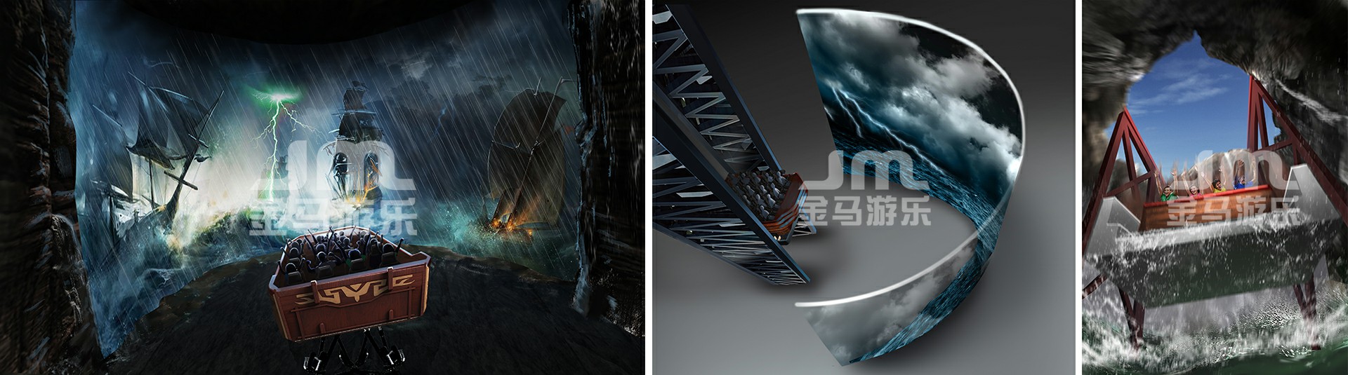 本項(xiàng)目由傳統(tǒng)的激流勇進(jìn)與影視元素相結(jié)合,船體造型新穎,此項(xiàng)目的車體運(yùn)行設(shè)有俯沖、傾斜、速降等元素,讓游客沉浸于驚險刺激的游樂體驗(yàn)中。