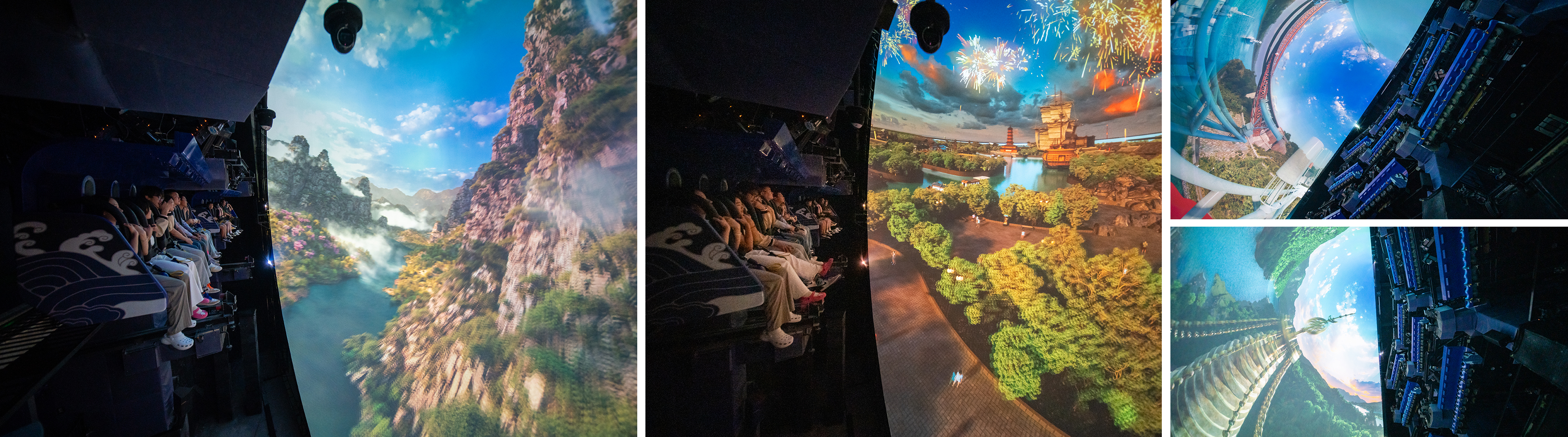 平推式飛行影院采用獨特的六自由度懸掛式動感座椅,逼真模擬墜落、爬升、轉(zhuǎn)彎等動作,與巨型大球幕影片內(nèi)容配合,產(chǎn)生身臨其境的全景式包圍的真實飛行,給游客帶來一場翱翔于空中的強烈沉浸式體驗。